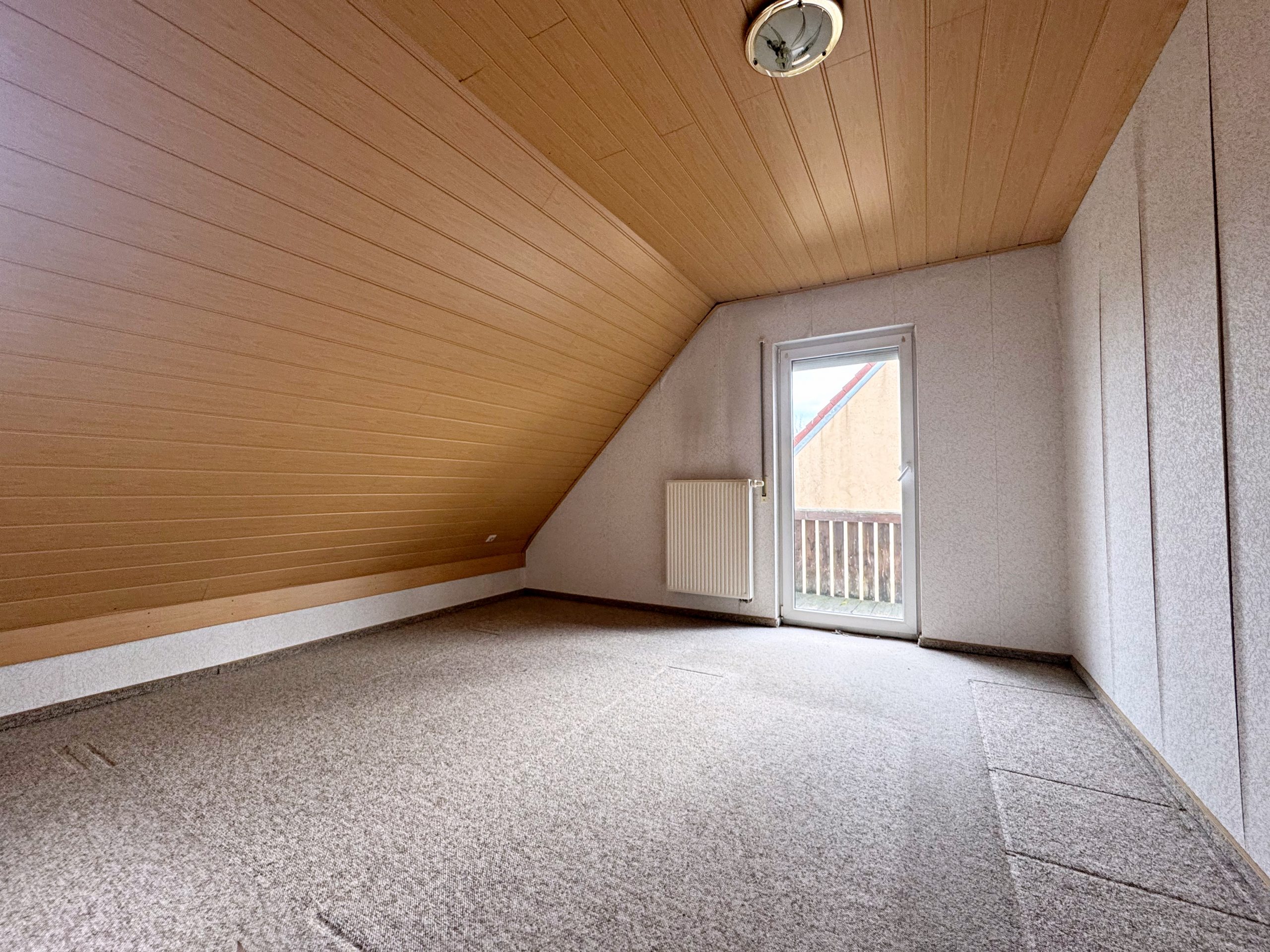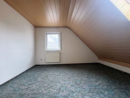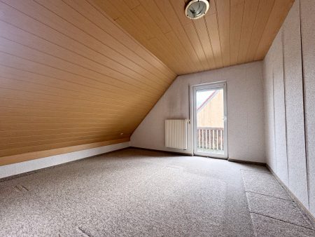 Das Obergeschoss präsentiert sich mit drei Schlafräumen. Durch die Dachschrägen ergibt sich eine größere Grundfläche, als die offizielle Wohnflächenangabe vermuten lässt. Zwei der Zimmer verfügen über einen direkten Zugang zum Balkon. Ein helles Tageslichtbad mit Badewanne und Dusche rundet diese Ebene ab. Zusätzlich steht der Dachboden als großzügige Abstellfläche zur Verfügung.