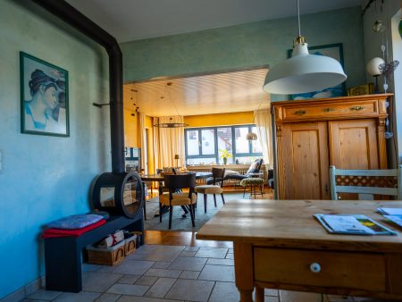 – Neuer Kaminofen im Wohn- Esszimmer mit Sitzbank von „Nordpreis“
