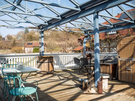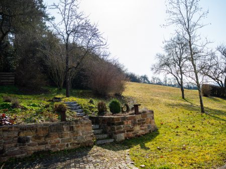 Hinter dem Haus erstreckt sich ein traumhaft angelegter Garten mit vielen Sitzmöglichkeiten bis zum Waldrand. Hier fühlt man sich geerdet und kann sich in Ruhe vom Alltagsstress erholen.